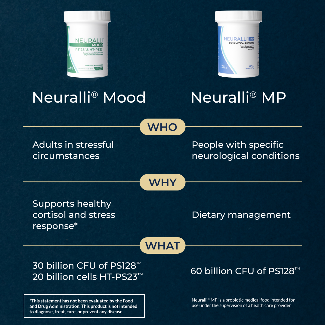 If you have a diagnosed mental or neurological health condition, consider Neuralli® MP probiotic medical food with our highest concentration of PS128TM per capsule.