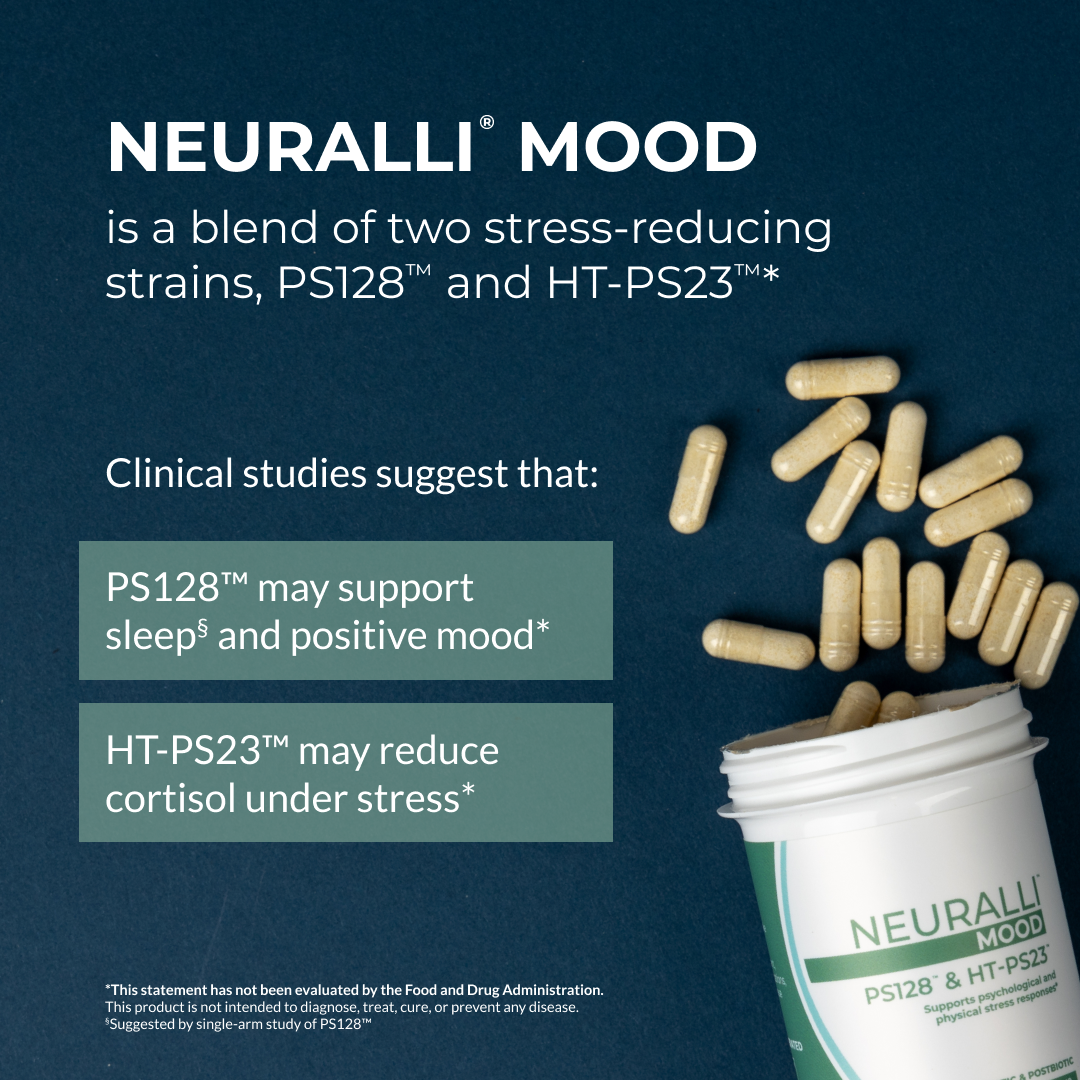 Please refer to our blog What to Know about Neuralli Mood and the hyperlinks within it to learn more about the benefits of Mood, as well as the science of PS128TM, HT-PS23TM, postbiotics, and the gut-brain axis.